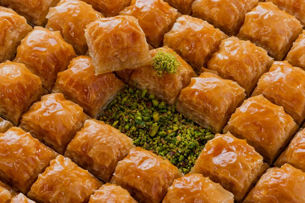 Baklava is a sweet layered pastry covered with honey or sweet syrup. It was invented in Ottoman Empire, but now is widely used in cuisines of many countries in the Middle East, Caucasus and Balkans.