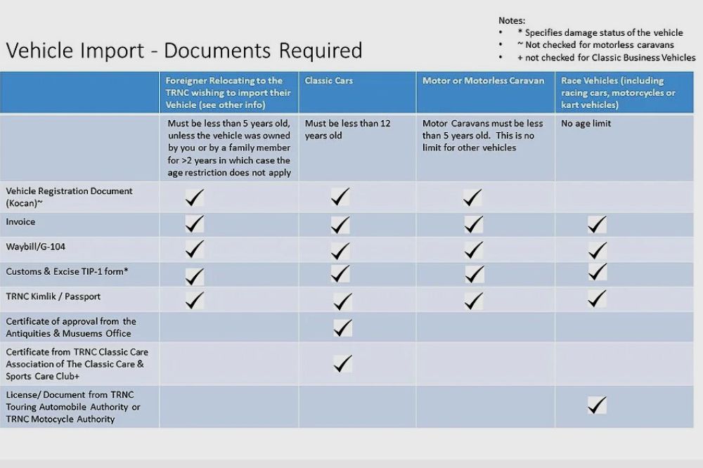 There are restrictions on the age of cars that can be imported to the TRNC. To calculate the age of a car determine the time between the Date of Vehicle initial registration to the entry date into the TRNC (as shown on the Waybill/G-104) For Classic cars only the year of the vehicle's manufacture is taken into account.