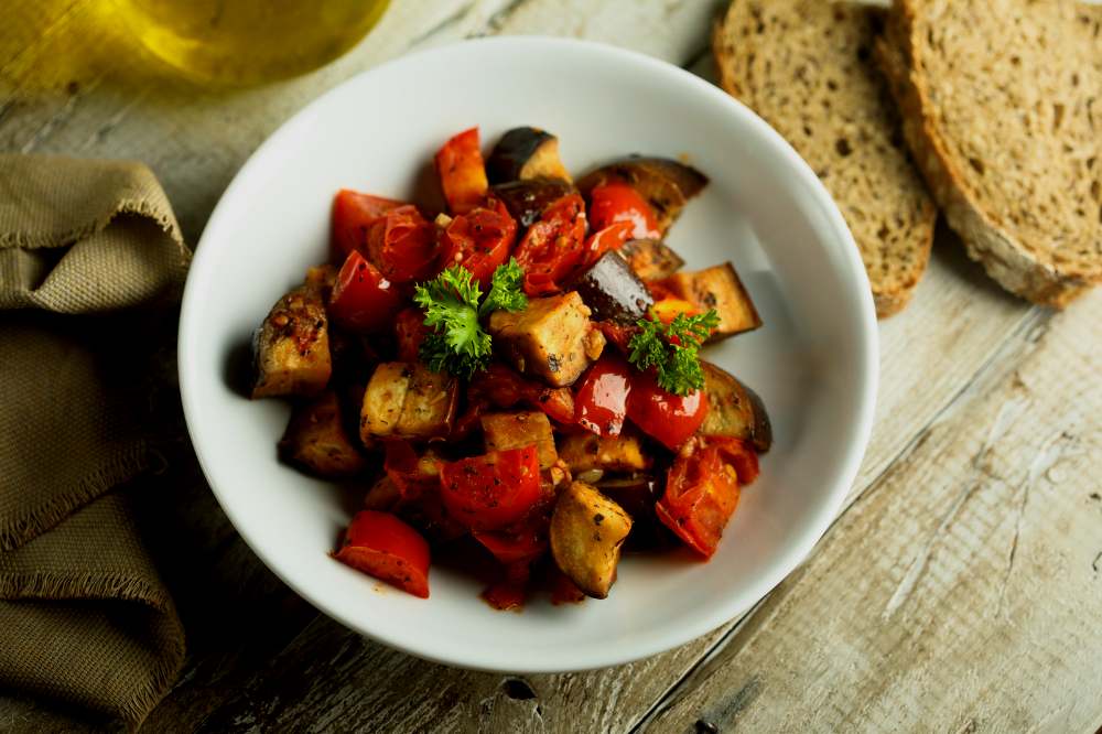 Karnıyarık is a dish found in Turkish cuisine consisting of eggplant stuffed with a mix of sautéed chopped onions, garlic, black pepper, tomatoes, optional green pepper, parsley and ground meat.