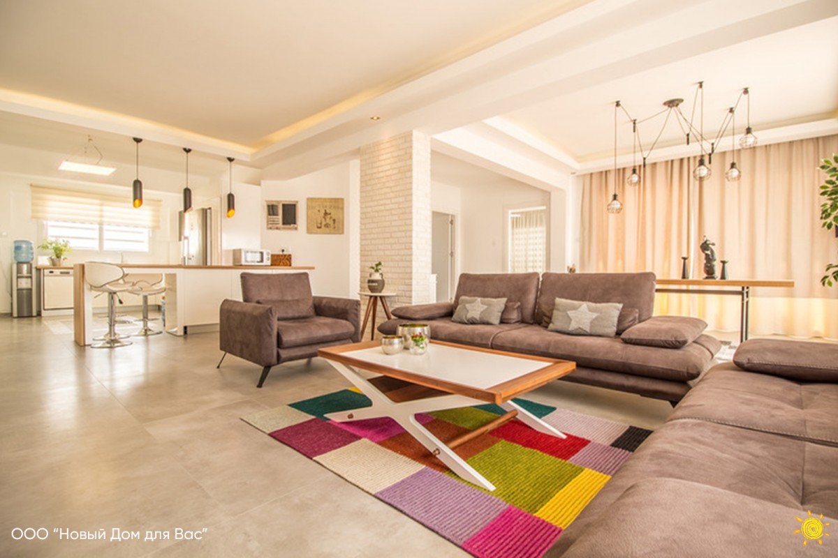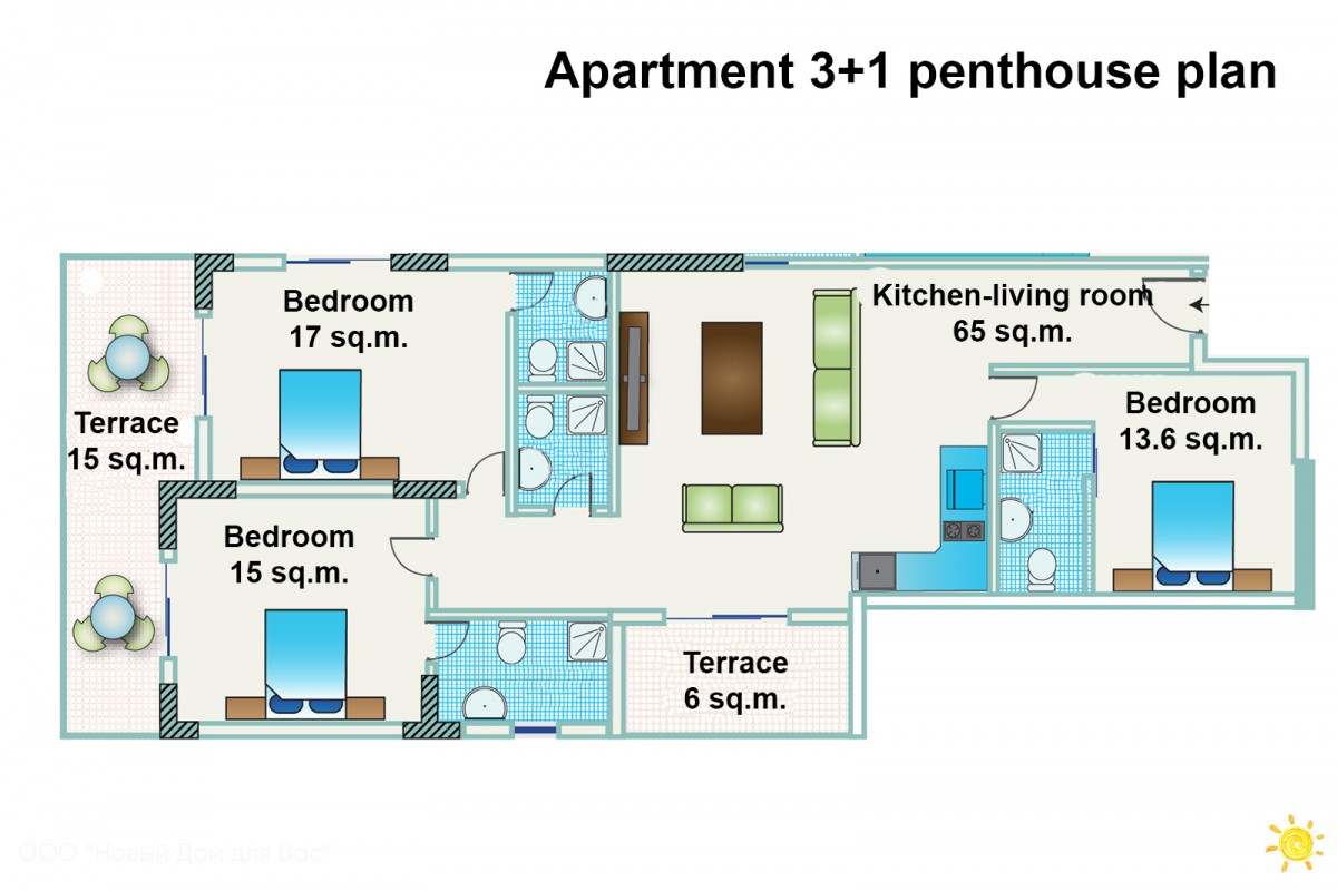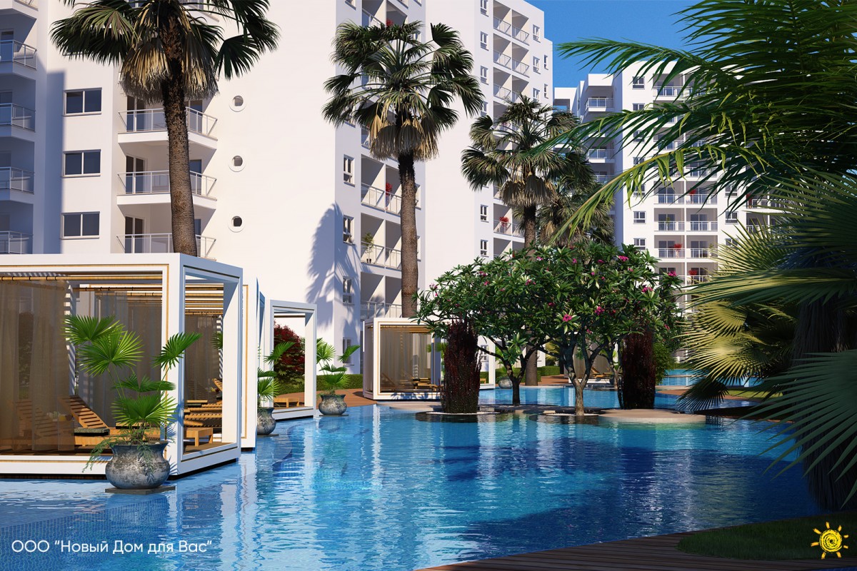 The complex is located in a well-maintained, landscaped green area. You can take advantage of foot paths and bike lanes as well as well-equipped picnic areas. The project offers great facilities that perfectly suit both for vacation and staying all year round: modern children's playgrounds and sports grounds, day-care centre, pools – both outdoor and heated indoor ones, aqua park, billiards, fitness centre, SPA, gym, café, restaurants, medical centre, pharmacy, ATMs, drycleaner's, supermarket, confectionery, beauty salon. There are car rentals and comfortable car parks in the complex. Animators of the complex regularly hold cultural events. The complex provides a free shuttle service to the beach and market in Iskele.