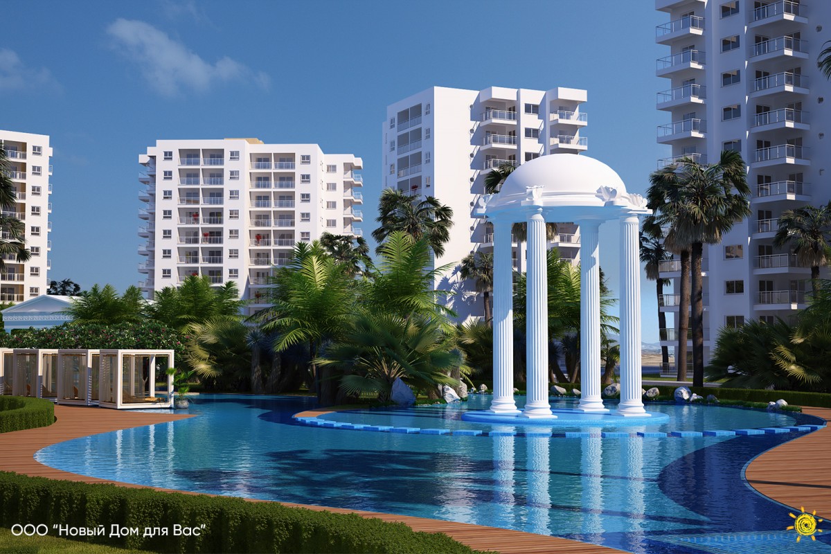 The complex is located in a well-maintained, landscaped green area. You can take advantage of foot paths and bike lanes as well as well-equipped picnic areas. The project offers great facilities that perfectly suit both for vacation and staying all year round: modern children's playgrounds and sports grounds, day-care centre, pools – both outdoor and heated indoor ones, aqua park, billiards, fitness centre, SPA, gym, café, restaurants, medical centre, pharmacy, ATMs, drycleaner's, supermarket, confectionery, beauty salon. There are car rentals and comfortable car parks in the complex. Animators of the complex regularly hold cultural events. The complex provides a free shuttle service to the beach and market in Iskele.