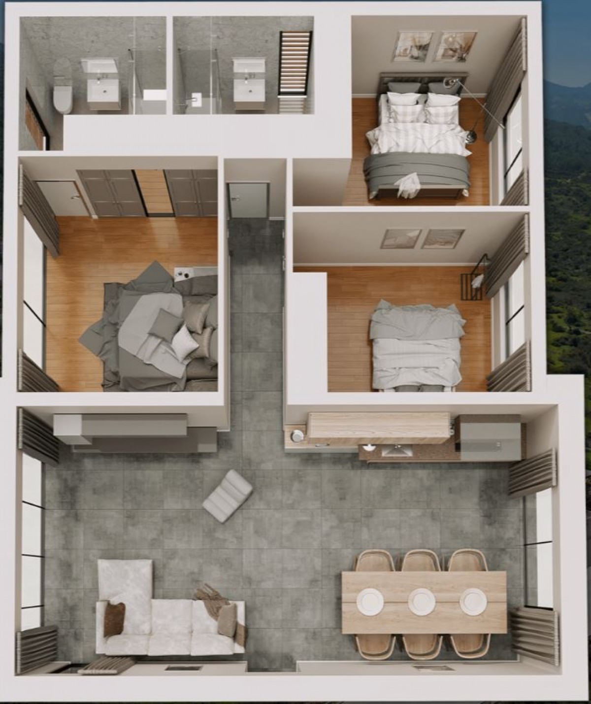 An interest-free installment plan is provided. The price of real estate objects includes full fit-out, sanitary ware, built-in furniture (built-in wardrobes in all bedrooms, fitted kitchen). The premium eco-friendly materials like wood, and natural stone, are used for interior finishing. Buyers have an opportunity to choose the texture, and the color of the materials according to their wishes. Optionally, a design package is available.