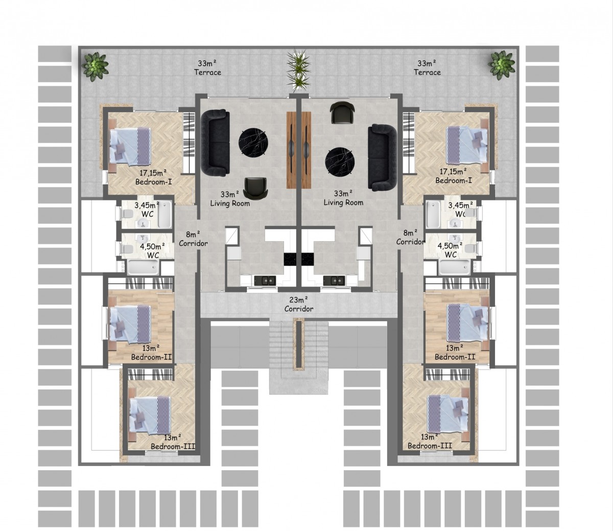 The price includes full interior finishing, built-in furniture (all bedrooms are equipped with built-in wardrobes with sliding doors; fitted kitchen), ceramic flooring, sanitary ware, built-in shower cabins, sinks in the bathrooms and in the kitchen, false ceiling in the living room and bathrooms. The apartments have double glazed windows, and are fitted with a central water supply system, central air conditioning infrastructure, satellite and internet systems, boiler. There is a communal swimming pool, cafes, recreation areas.