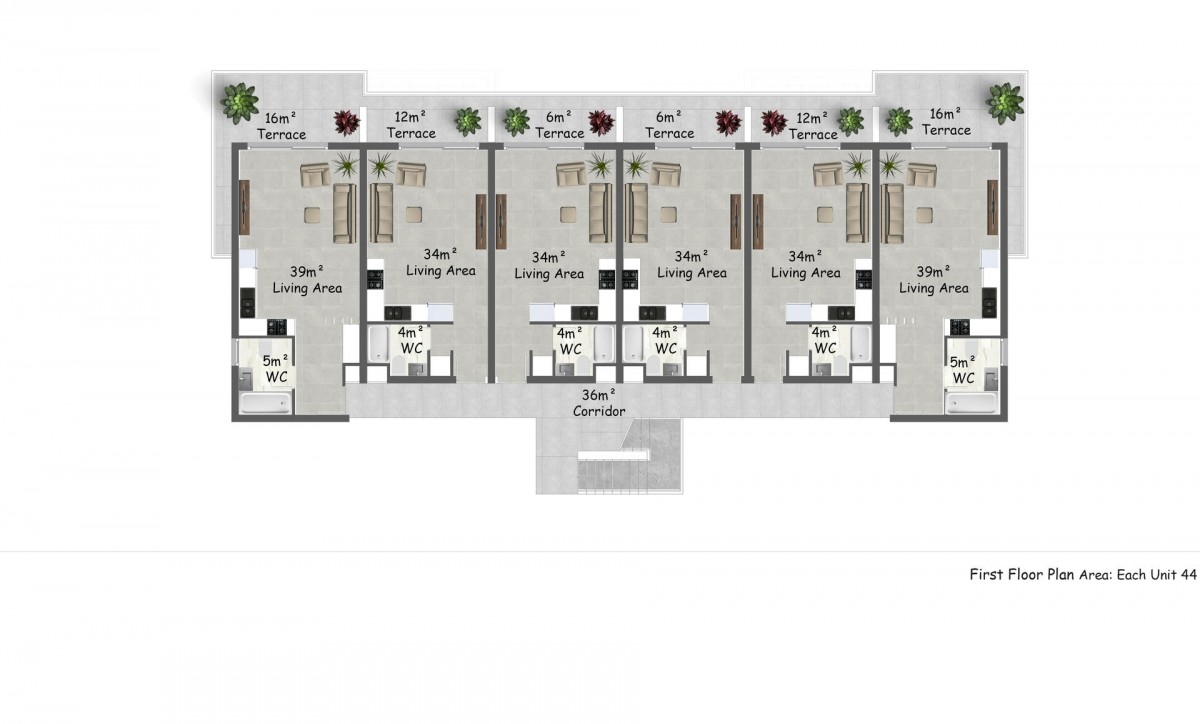 The price includes full interior finishing, built-in furniture (all bedrooms are equipped with built-in wardrobes with sliding doors; fitted kitchen), ceramic flooring, sanitary ware, built-in shower cabins, sinks in the bathrooms and in the kitchen, false ceiling in the living room and bathrooms. The apartments have double glazed windows, and are fitted with a central water supply system, central air conditioning infrastructure, satellite and internet systems, boiler. There is a communal swimming pool, cafes, recreation areas.