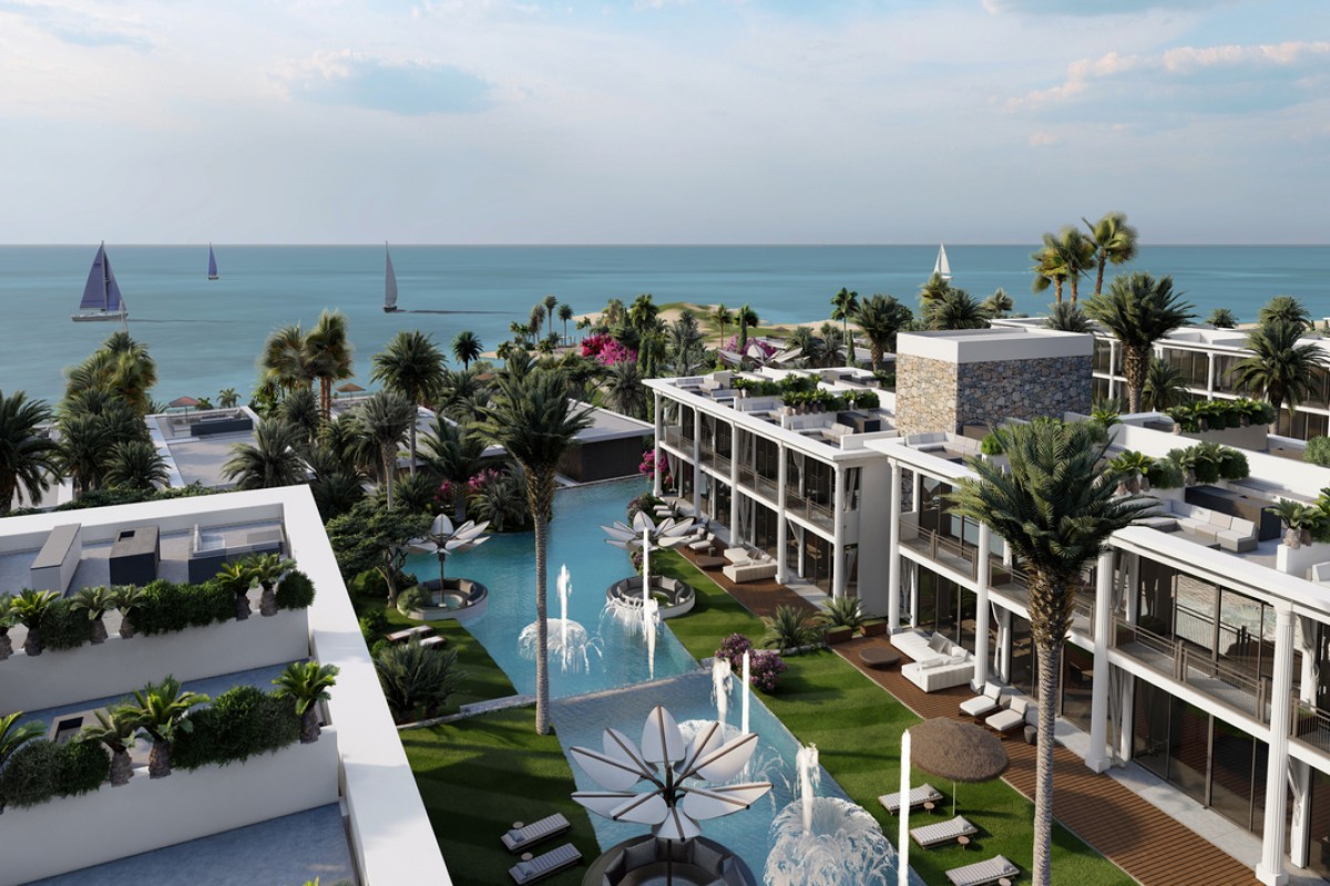 The landscaped territory of the entire complex includes walking paths, recreation areas, parking spaces, pools with fountains and a light show. The amenities offer a heated indoor pool, spa, sauna, hammam, massage room, gym, outdoor tennis court, restaurant, open-air cinema on the beach.