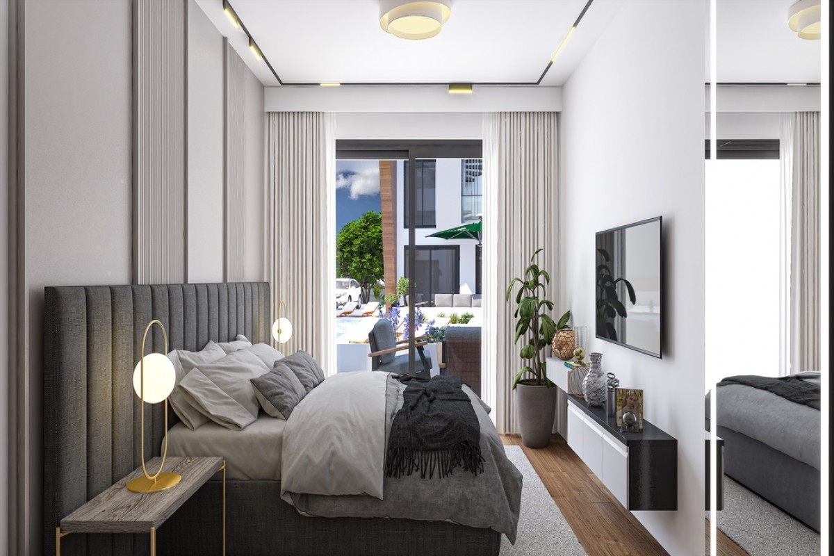ID 142 Residential project is located in Yeni Boazichi, and has an extensive developed infrastructure around, access to parks with many walking paths, sports grounds, entertainment facilities. The ancient city of Salamis is 4 kilometers away, while a well-developed sandy beach is 1.5 kilometers away, where one can find numerous entertainments, recreation areas, and active sports. The project provides for access roads, parking, sophisticated landscape design of the territory, recreation areas by the pool, a shop, a pharmacy, a bank, a video surveillance system.