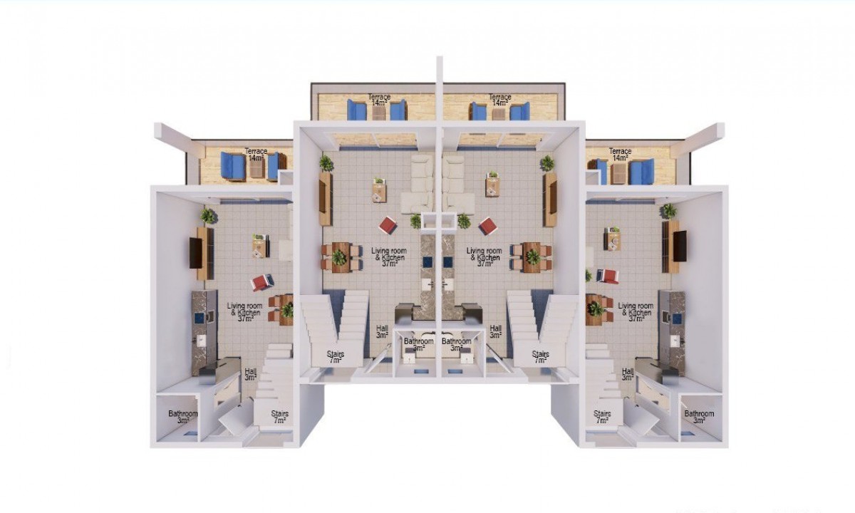 Townhouses are provided with an interest-free installment plan. The price includes full interior finishing, built-in furniture (built-in wardrobes in all bedrooms, built-in kitchen cabinets), sanitary ware. The houses are fitted with a water pressure system, double glazed windows, interior doors, underfloor heating in the bathroom. Townhouses with 2 bedrooms and 1 living room are in blocks designed for 4 families.