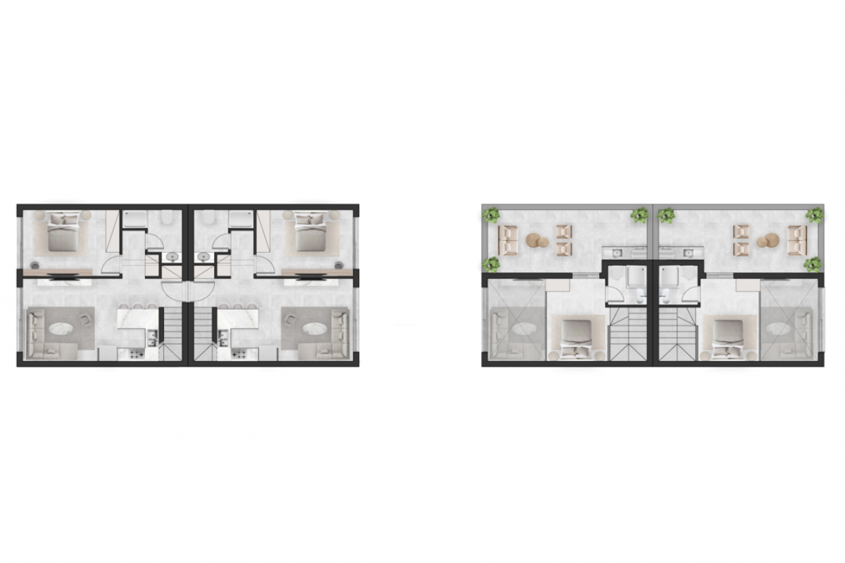 Blocks of type C are built around the second communal pool. Each block has 4 apartments. On the ground floor there are 1+1 apartments with terraces, on the first floor there are 2+1 loft apartments with terraces on the second level. The complex has a closed area with a barrier, access roads, and parking lots. The social amenities include 2 communal swimming pools, landscaping of the territory, playgrounds, recreation areas, and a pool bar. An equipped sandy beach with numerous entertainments is 1 kilometer away. Supermarkets, cafes, and restaurants are within walking distance.