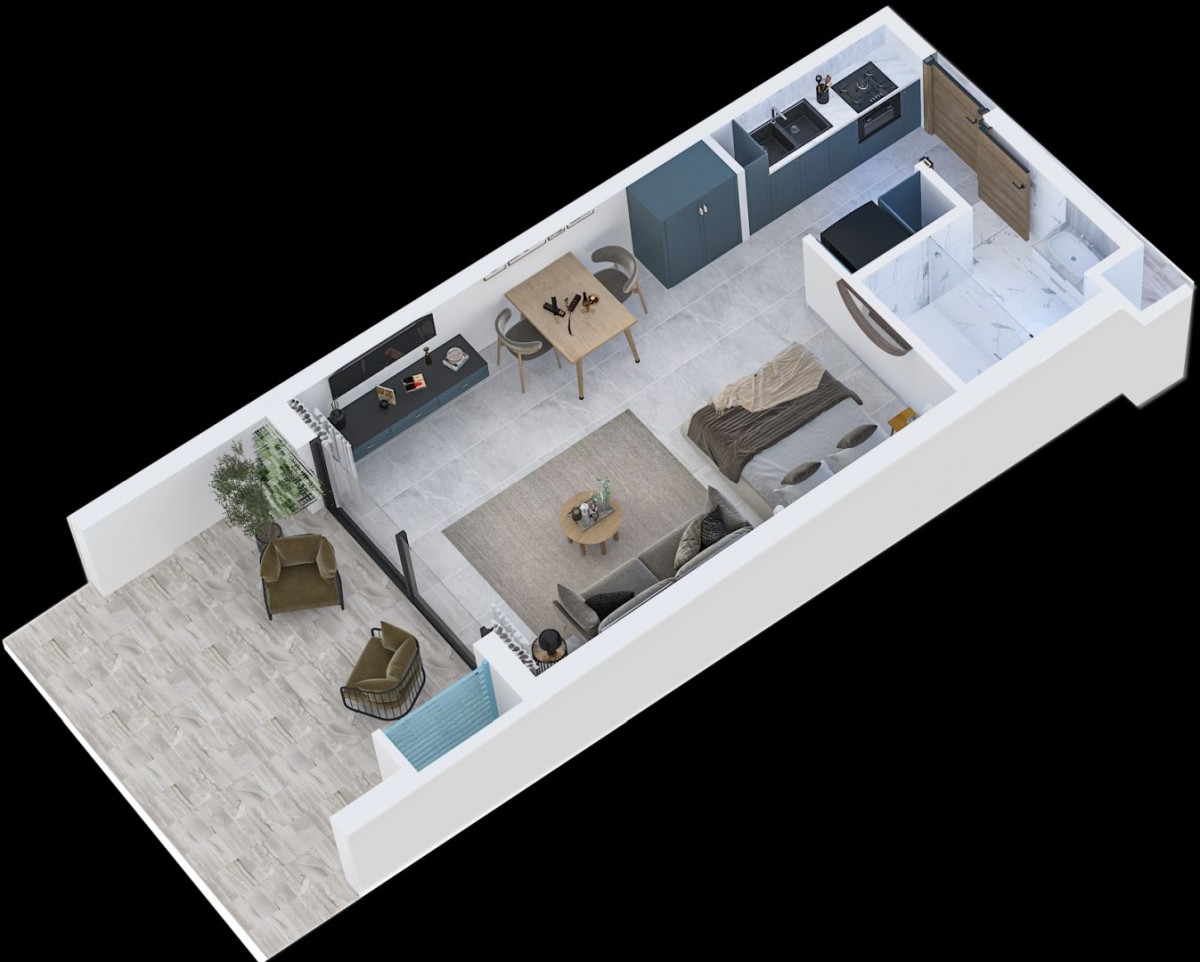 Studio apartments are located on the ground floor of type F blocks. The price of the apartments includes full interior finishing, built-in furniture (built-in wardrobes in all bedrooms, built-in kitchen cabinets with granite countertops), sanitary ware. Each unit is equipped with a water pressure system, an air conditioning system, a satellite and Internet system, double-glazed windows, interior doors, and underfloor heating in the bathroom. The project is developed in a modern style with the use of high quality materials. The complex is maintained by a management company.