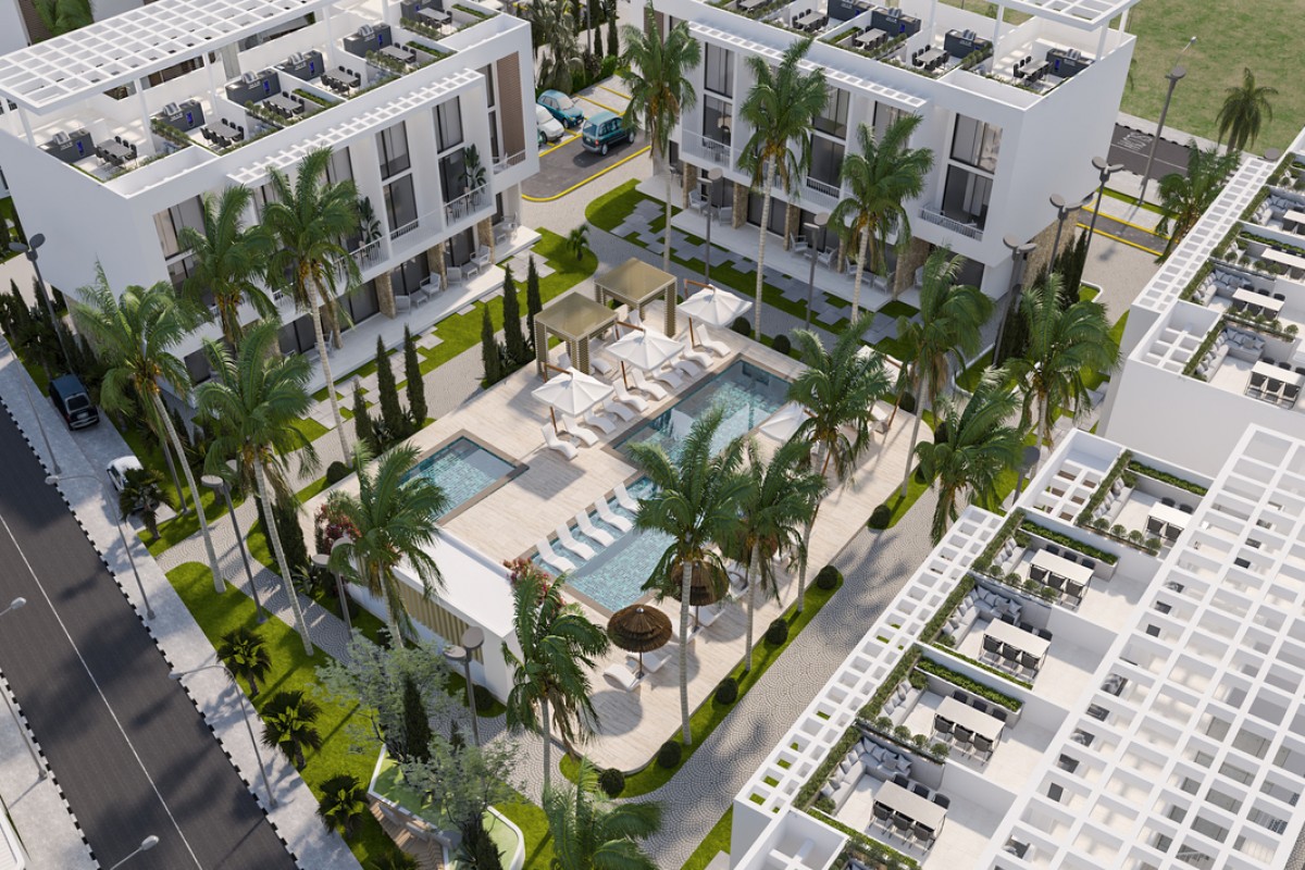 ID 196 Residential project is located 100 meters from the coastline in the Esentepe area. Residential blocks are designed around communal and recreation areas. Ground floor apartments have direct access to the pools, private gardens.