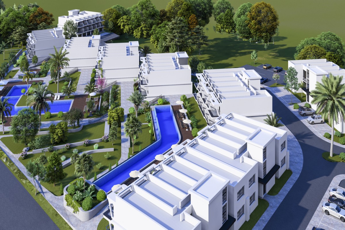 Residential project ID 214 is located 500 meters from the northern coastline in the Tatlisu area. The complex is represented by two-story residential blocks with studio and 1+1 apartments on the ground floor, and studio and 1+1 penthouses with roof terraces on the first floor. The apartments of the complex have panoramic views of the sea, mountains, and the territory of the complex.