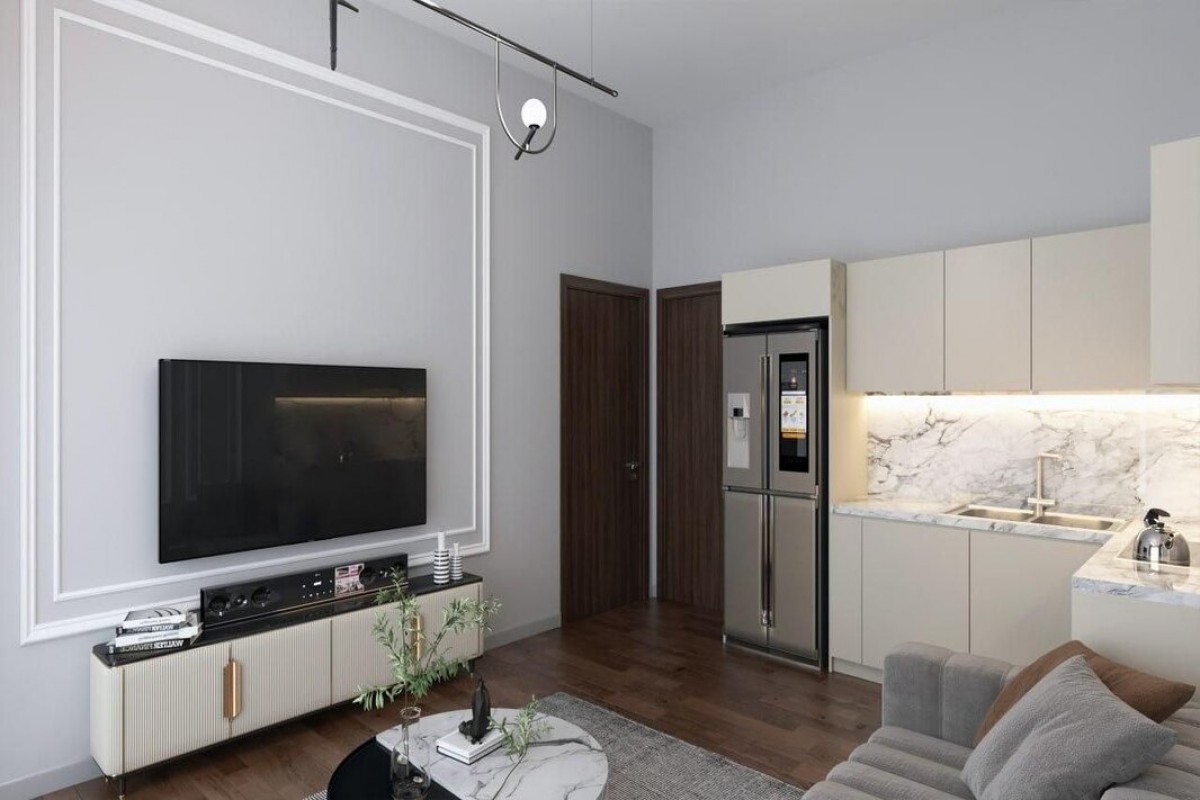 There is an interest-free installment plan provided. The price includes full interior finishing, built-in furniture (built-in wardrobes in the bedroom, built-in kitchen cabinets), sanitary ware, showers, flooring. A water pressure system, double glazed windows, and interior doors are installed.