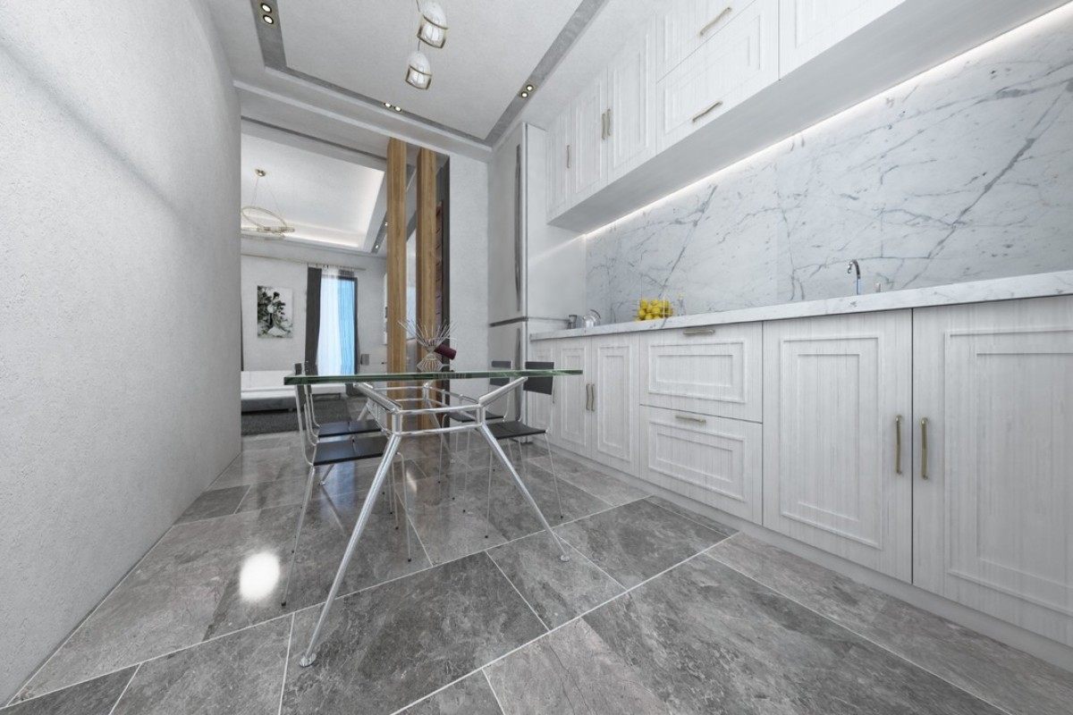 The price includes full interior finishing using natural stone and wood, built-in furniture (built-in wardrobes in the bedrooms, built-in kitchen cabinets with granite countertops), ceramic flooring, equipped bathrooms with installed sanitary ware, underfloor heating, entry and interior doors, hidden air conditioning system, and double glazed windows.