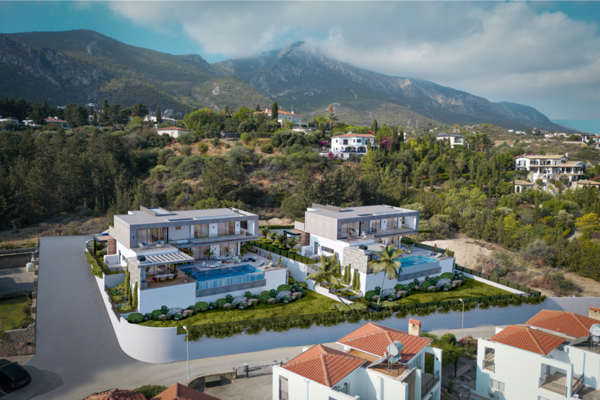 These villas offer stunning views of the Kyrenia region and the mountains. The popular beaches along the coast are approximately 2 km away. The area boasts well-developed infrastructure: a hospital, a children's polyclinic, a kindergarten, supermarkets, cafes, restaurants, gas stations, beauty salons, markets, entertainment parks, car rental services, and the prestigious English School of Kyrenia, which offers a British curriculum. The Cyprus Science University is located within 3 km. Additionally, The American Future College, Necat British College, and Girne American University are within a comfortable driving distance.