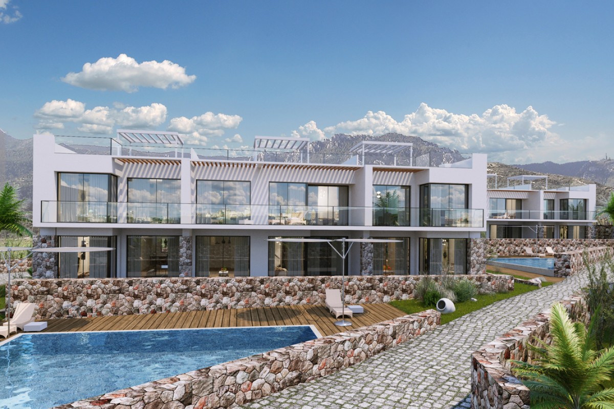 The residential complex is located 200 meters from the coastline in the Kuchuk-Erenkoy area. The equipped beach is 700 meters away. The popular Korineum Golf & Beach Resort is a 15-minute drive away. The area has many cafes and restaurants along the coastline, a supermarket, and a gas station. The village of Esentepe is a 10-minute drive away, and the city of Kyrenia (Girne) is a 20-minute drive away, offering a developed infrastructure of the city (a large selection of shops, restaurants and cafes, a supermarket, pharmacies, banks, a market, schools and kindergartens, universities and much more).